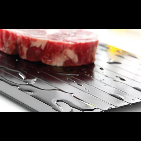 Todos, en ocasiones, nos hemos olvidado de sacar la carne congelada del congelador para preparar la comida de la noche, luego la descongelamos apresuradamente en el microondas (cocinando parcialmente los bordes) o tuvimos que pedir un domicilio de «comida rápida» de última hora. Esta bandeja para descongelar resuelve este problema común al permitirle descongelar alimentos congelados hasta 10 veces más rápido que a temperatura ambiente.